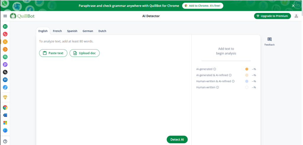 - Upload or Paste Your Content: Simply paste your text or upload a document into the QuillBot AI Detector platform.