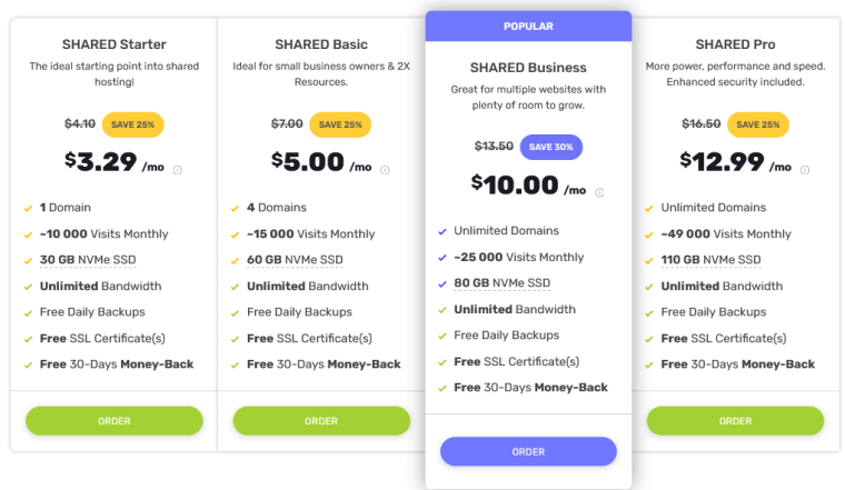 على سبيل المثال، توفر الحزمة الأساسية لاستضافة UltaHost المشتركة 15 جيجابايت من مساحة القرص وباندويث غير محدود بتكلفة 3.29 دولارًا شهريًا (37 دولارًا سنويًا).