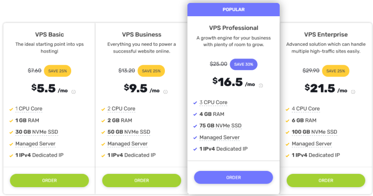 خطة VPS للأعمال لتشغيل موقع ويب ناجح عبر الإنترنت بسعة 50 جيجابايت ووحدتي معالجة مركزية وذاكرة وصول عشوائي 2 جيجابايت تكلف 9.50 دولارًا شهريًا (95.50 دولارًا سنويًا).