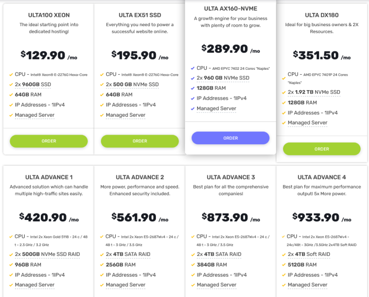 سواء كانت استضافة مخصصة بأفضل أداء، أو أرخص استضافة مشتركة، أو أرخص استضافة ووردبريس، فإن جميع خوادم UltaHost مجهزة بأقراص SSD NVMe.
