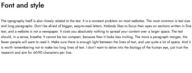 ترتبط فن صياغة الحروف ارتباطًا وثيقًا بالنص، وهي مشكلة مستمرة في معظم المواقع. أكثر هذه المشاكل شيوعًا هي حجم النص والفقرات الطويلة. لا تخف من النصوص الكبيرة سهلة القراءة. لا أحد يحب أن يركز أعينه على الأقسام المكتوبة بخط مميز، فالموقع الإلكتروني ليس صحيفة ورقية. لن يكلفك أي شيء على الإطلاق نشر المحتوى الخاص بك على مساحة أكبر.