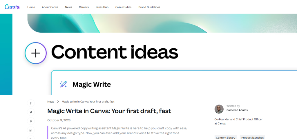 Canva Magic Write is perfect for creators who need quick captions, headlines, or descriptions to pair with visuals. It’s especially useful for social media managers and educators creating slides or infographics.