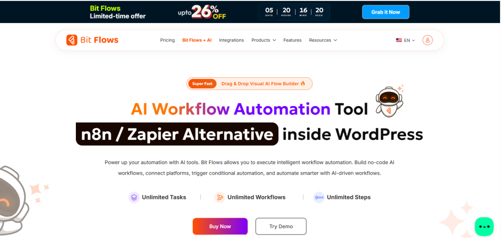 Bit Flows is an AI-powered workflow automation tool designed to be fast, flexible, and powerful. It goes beyond simple task automation by helping you build smart, AI-driven workflows that connect WordPress, SaaS apps, and even custom tools with over 200+ integrations. You can automate everything from email marketing and CRM updates to form submissions, LMS activities, and WooCommerce or Shopify events.