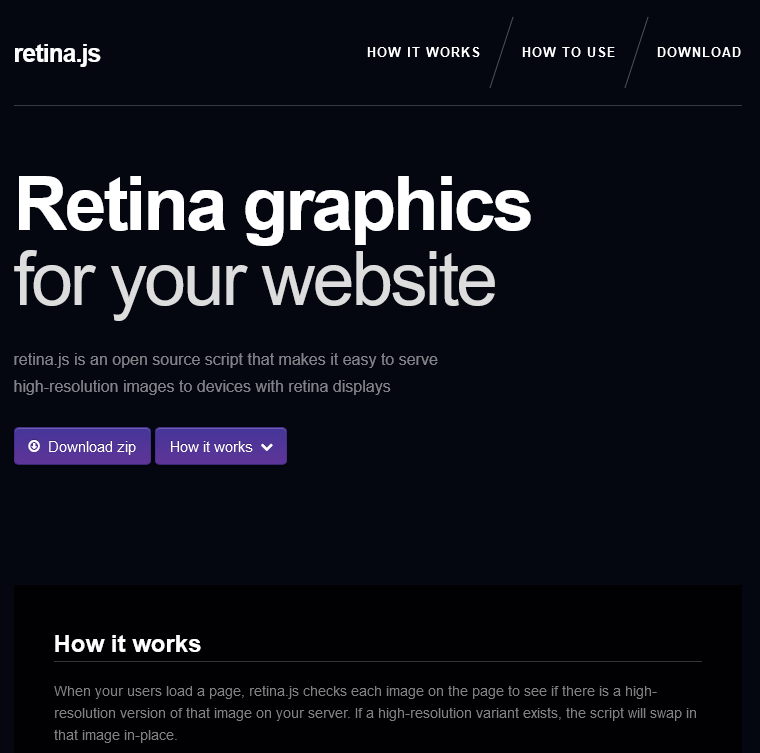 Perpustakaan front-end sangat berguna dalam kasus tersebut. Solusi ideal untuk mengatasi layar semacam itu adalah perpustakaan retina.js, yang memeriksa apakah perangkat keras menggunakan layar dengan piksel kepadatan tinggi. Jika iya, perpustakaan ini akan mencari gambar khusus Retina di server dan secara otomatis menampilkannya.