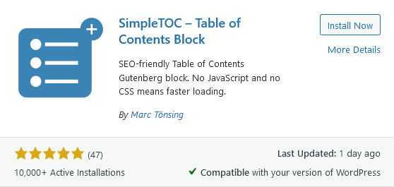 Se você se interessa por soluções simples, então eu suponho que você vá seguir o mesmo parâmetro para todos. Com isso, o SimpleTOC é simples e otimizado para o editor Gutenberg e, apesar de sua baixa popularidade, vale a pena experimentar.